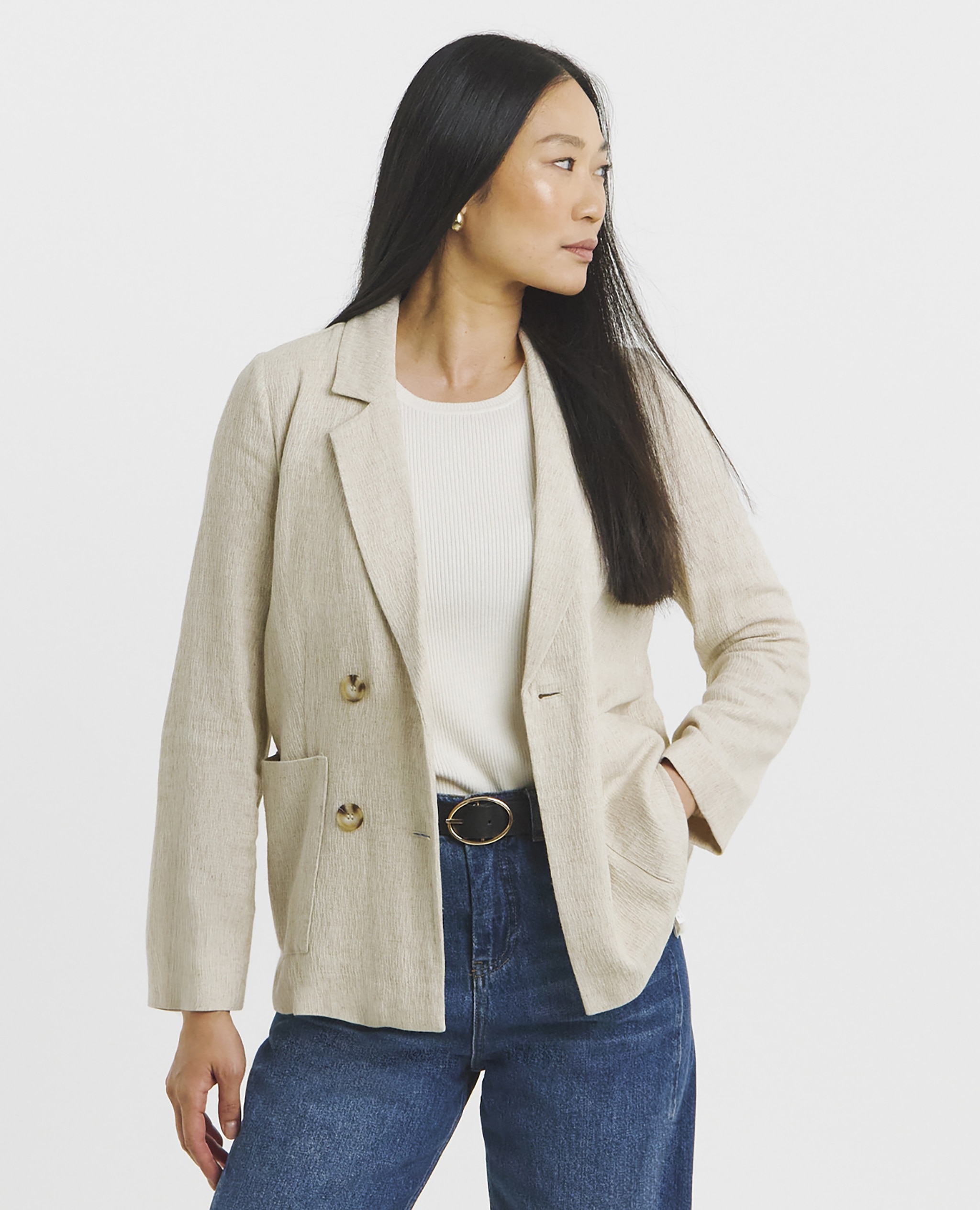 This spring, unstructured cuts in linen or cotton blends are the ones to look for. They have a lightness that feels right for the season without losing any of the sharpness that makes a blazer so useful.