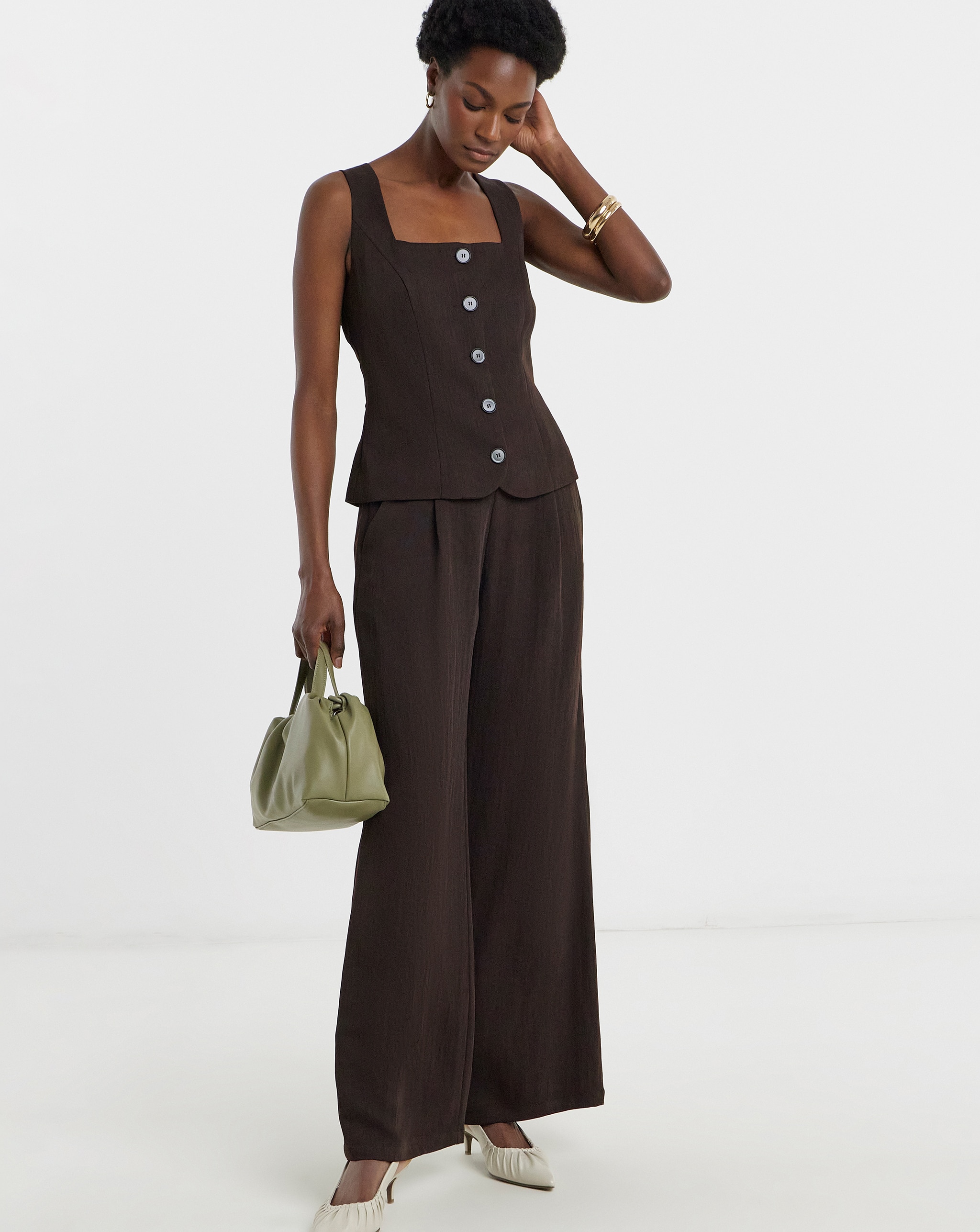 Here's a clever summer styling trick: skip the jacket entirely and opt for a tailored waistcoat instead. A waistcoat trouser suit offers all the sophistication of traditional tailoring whilst keeping you wonderfully cool. This look works beautifully for daytime garden parties, outdoor ceremonies, or relaxed summer receptions. Choose a longline waistcoat for added elegance and coverage, paired with wide-leg linen trousers in a coordinating colour.