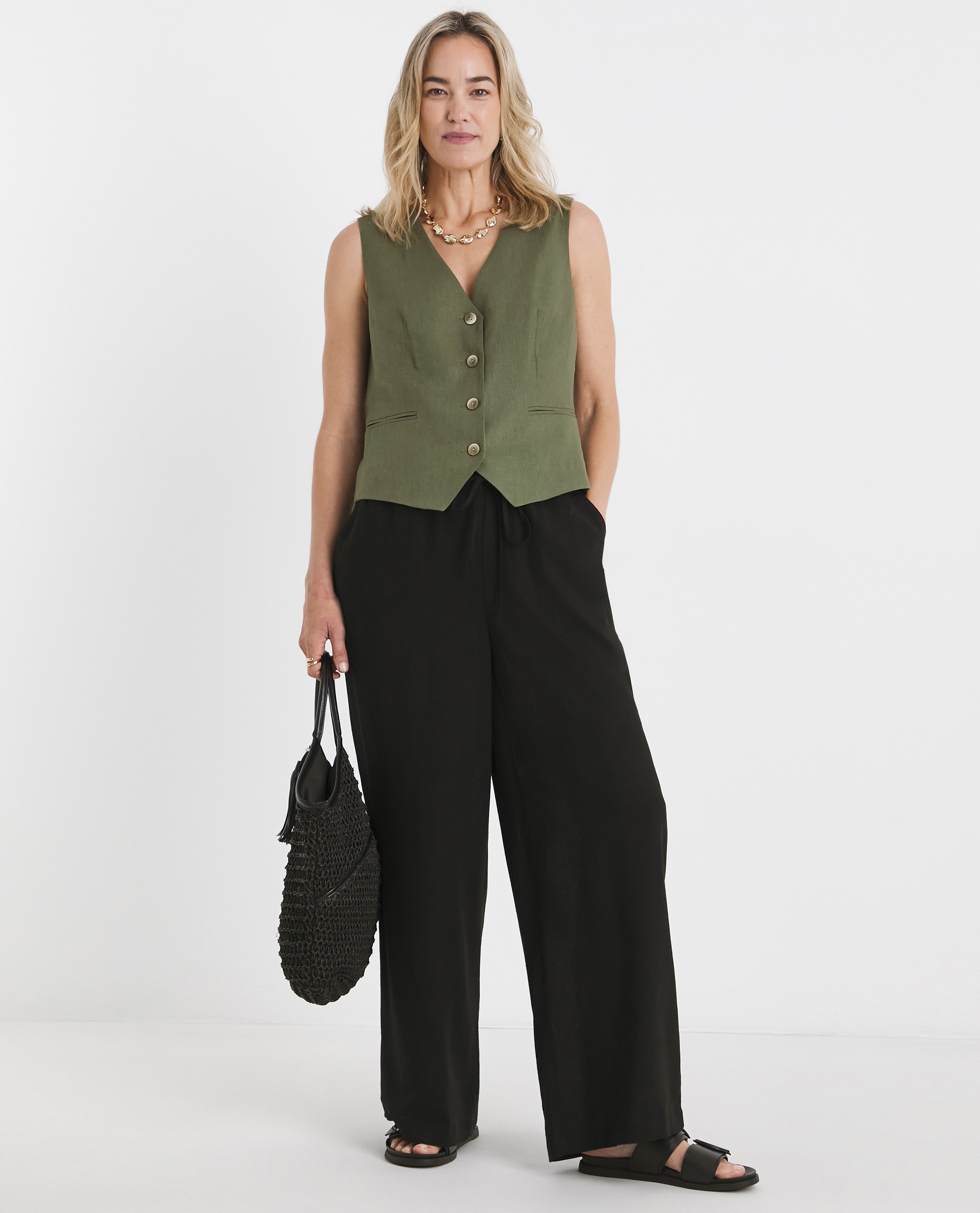 The key to styling wide leg linen trousers is balance. The volume at the bottom means you want to keep the top half more fitted, so a tucked-in blouse, a fitted ribbed top, or a sleek waistcoat all work beautifully to define the waist and create a flattering silhouette.