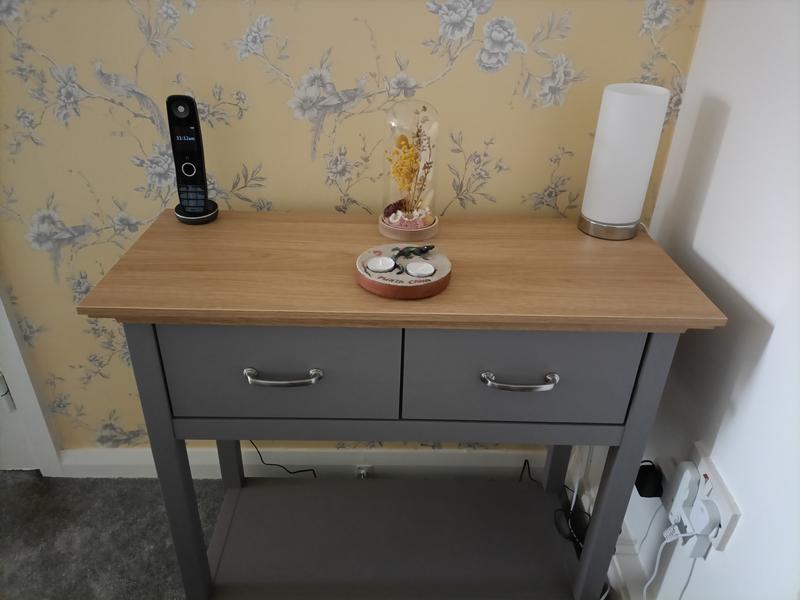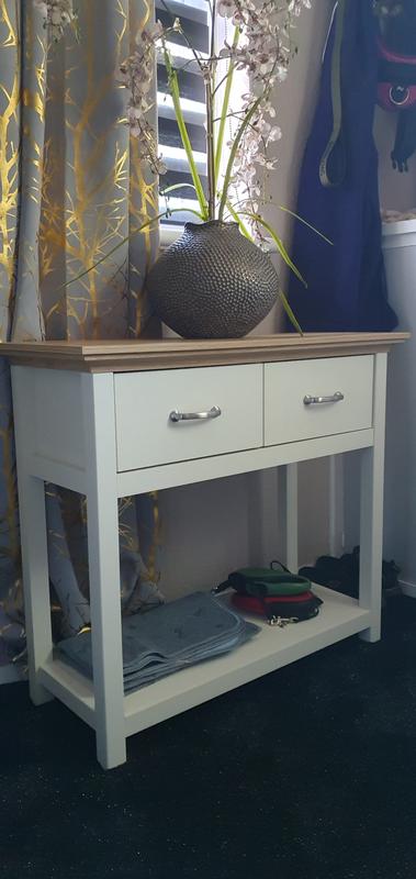 Just arrived today was a bit anxious about putting it together but the instructions were very easy to follow .on my own it took ab...Lovely console table.